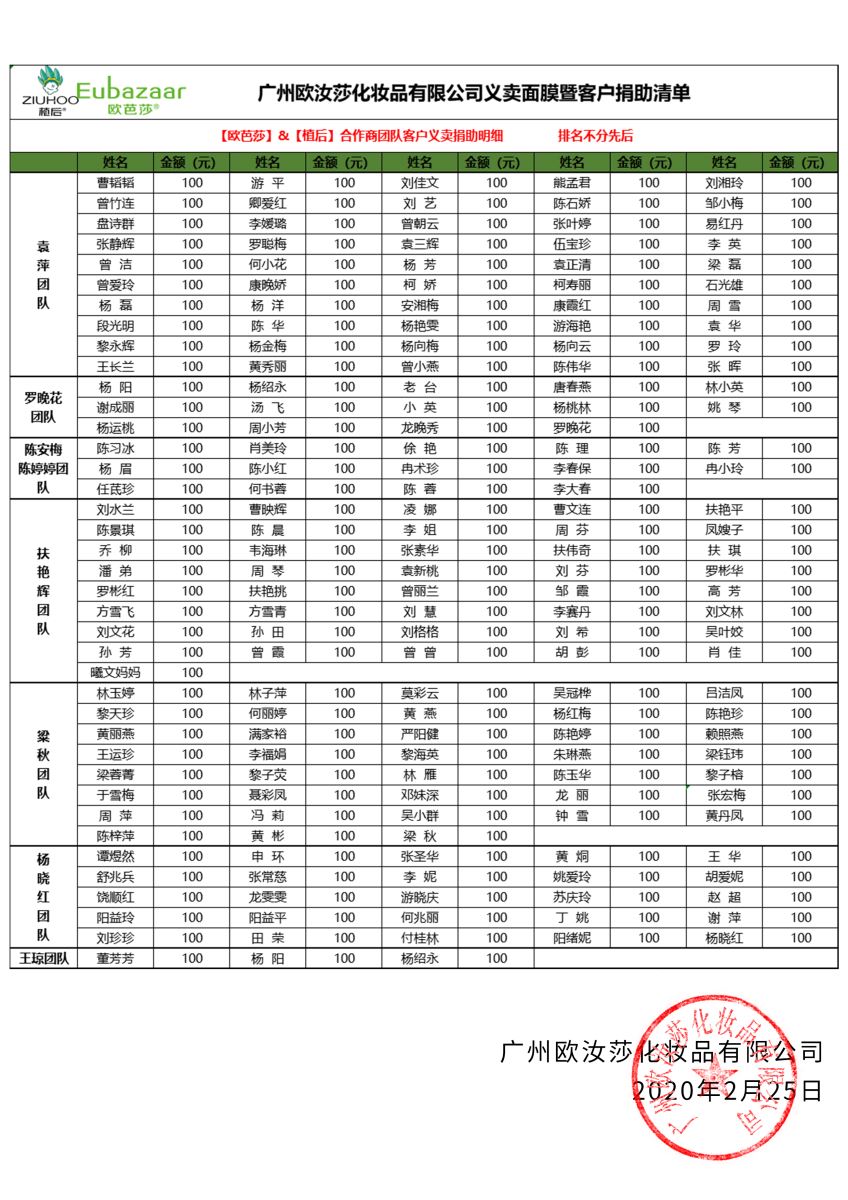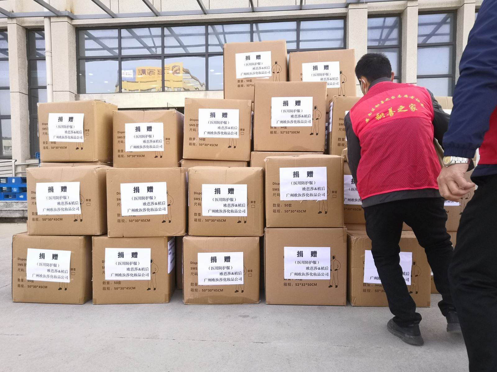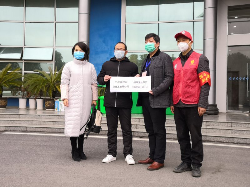 截止到2020年2月,经广州欧汝莎化妆品有限公司董事长严红安先生的指导,通过多方渠道协调,筹得第一批物资2000件防护服及医用口罩全计12万元,捐赠给湖北孝南疾控中心、第一人民医院、中南医院、妇幼保健院等机构。